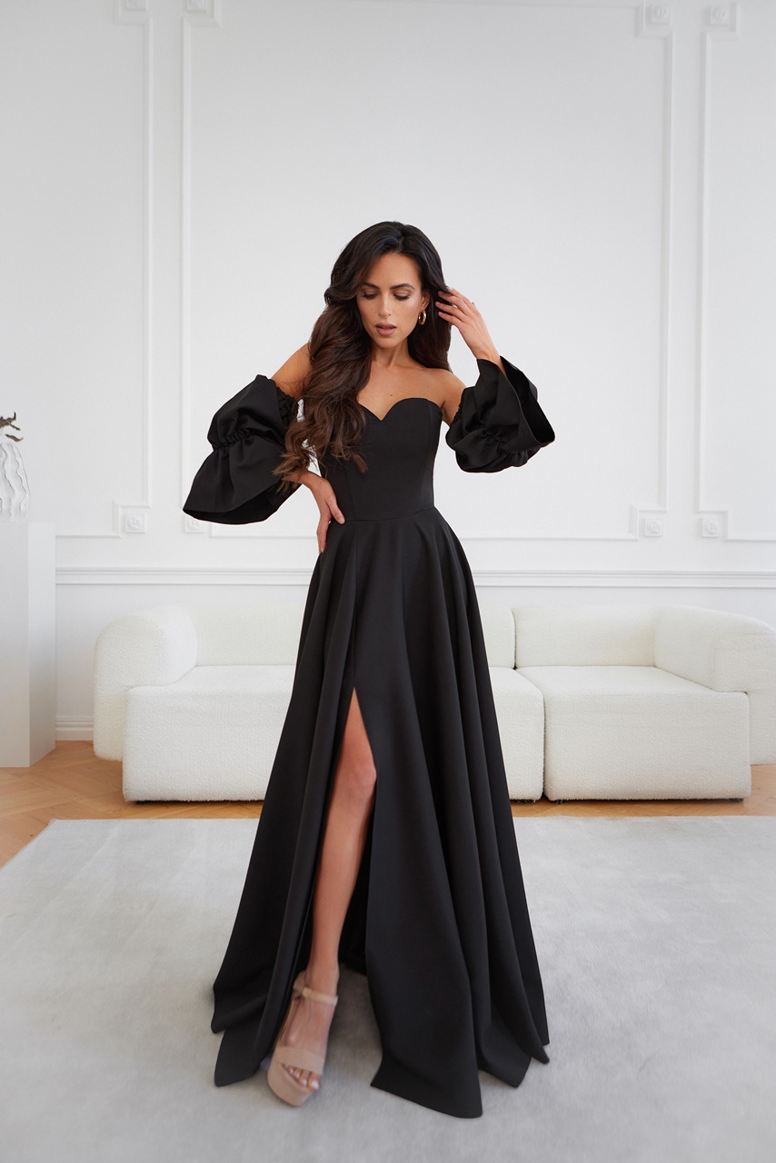 Dół uszyty z pełnego koła z rozporkiem. Rękawy w zestawie, nie są przyszyte do sukni.