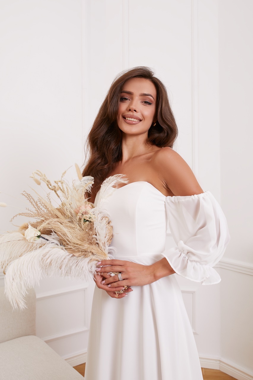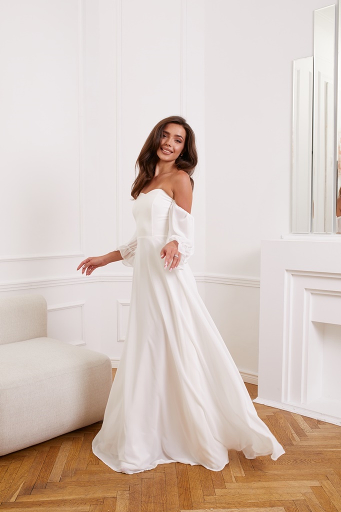 LAURA w wersji ślubnej to kwintesencja delikatności i subtelnej elegancji. Idealna dla Panny Młodej, która marzy o romantycznym, lekkim looku z nutką nowoczesnej prostoty.