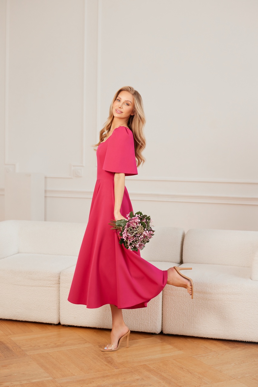 Model MADELINE to subtelna i kobieca propozycja, która doskonale sprawdzi się na komunie i inne eleganckie uroczystości. Delikatny dekolt pięknie podkreśla linię biustu, nadając sylwetce lekkości i harmonii. Zwiewny rękawek dodaje całości dziewczęcego uroku, a długość midi podkreśla klasyczny, ponadczasowy charakter sukienki. To model, który łączy wygodę z elegancją, idealny na ważne rodzinne chwile.