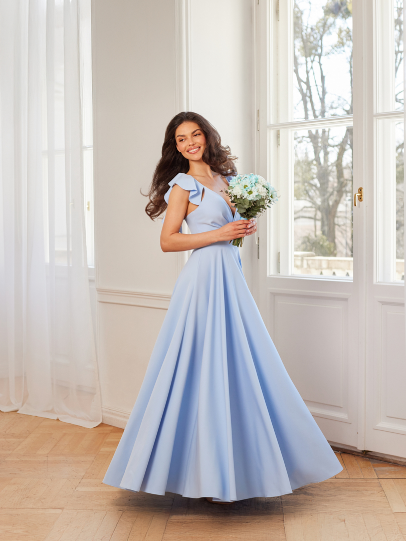 ROZALIA - efektowna suknia z falbanami na ramionach w kolorze błękitnym